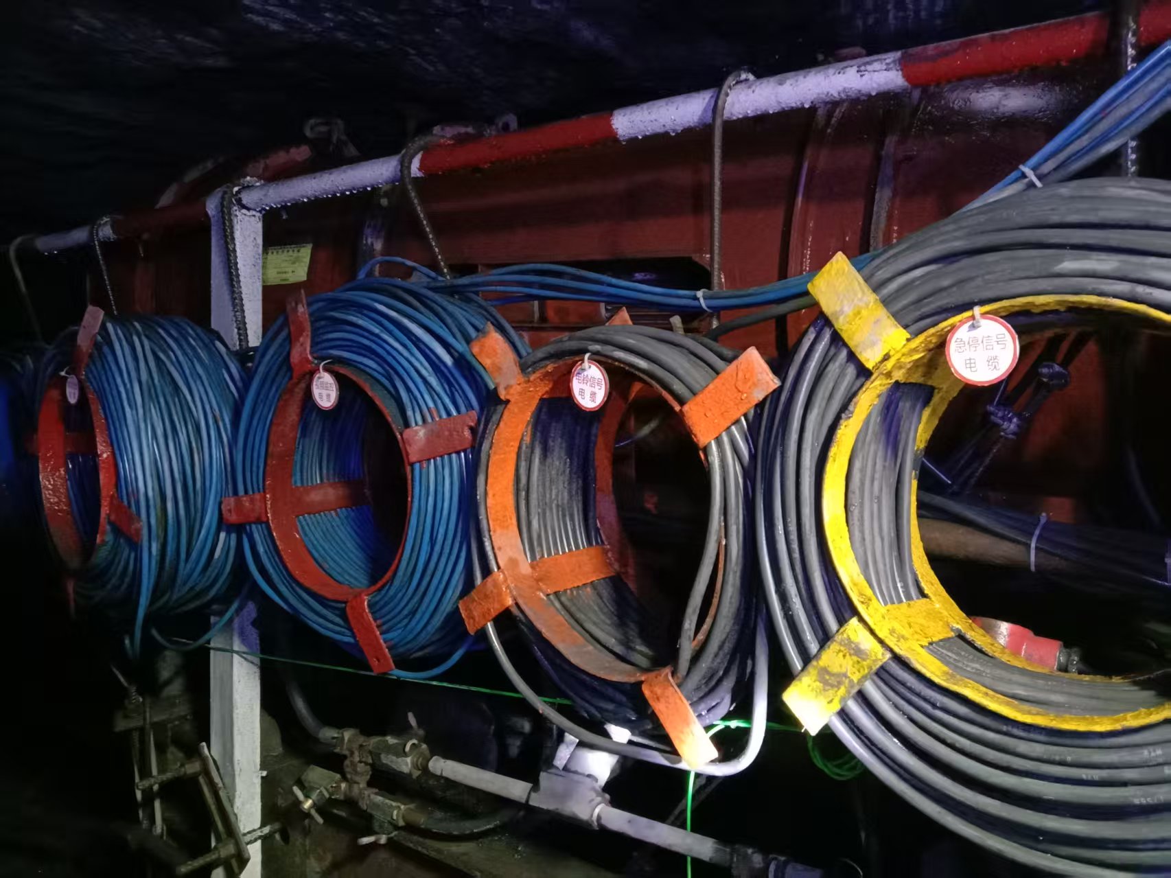 升級改造過程中,金達煤礦按照新版《煤礦安全規(guī)程》及機電設(shè)備管理標準,對掘進機電纜實施“分類整理、分區(qū)吊掛”,用紅、黃等色帶將動力電纜、信號電纜區(qū)分隔離,采用專用電纜鉤按“橫平豎直”規(guī)范電纜吊掛,并為每卷電纜配備醒目標識牌,標注電纜型號、用途、長度及責(zé)任人,便于日常巡檢與快速識別;同時,對七采區(qū)機頭區(qū)域煤倉護欄進行加固并除銹刷漆,統(tǒng)一牌板懸掛,保證位置合理、內(nèi)容醒目,為推動礦井安全生產(chǎn)標準化建設(shè)奠定了堅實基礎(chǔ)。